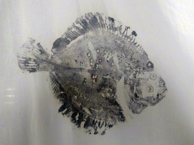 LOPHIIDAE (Rodaballo). Técnica Gyotaku sobre tela. Tinta wasi y acuarela.